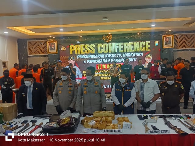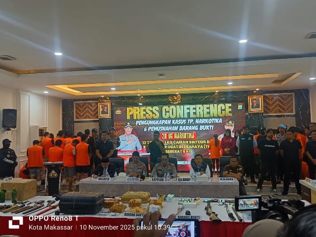 Makassar sulsel – Kapolda Sulsel, Irjen Pol. Djuhandhani Rahardjo Puro, memimpin press conference pengungkapan kasus narkotika dan penculikan anak di bawah umur di Polrestabes Makassar senin 10 november 2025